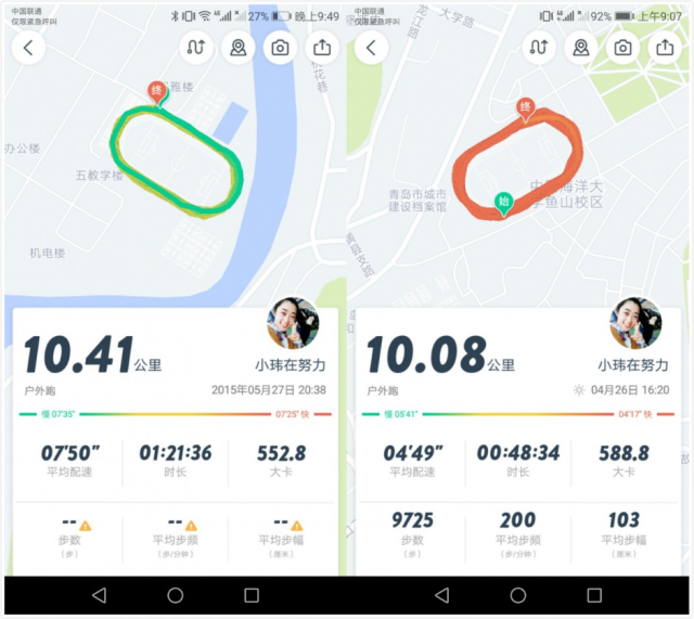 2016年进入中国海洋大学到现在,是我飞速提高的一个阶段。我的第一个师傅,王永洲叔叔,是在海大操场刷圈认识的。他教我摆臂、脚掌着地、如何呼吸,那一天,我的配速第一次进入6分多。再后来,有意识的去学习其他人如何跑步,如何提高配速,再加上跑量上去,速度也越来越快,现在偶尔还会进入4分多配速。所以,这5年,还好,我还在坚持跑步,还在不断进步。