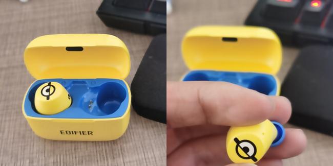 充电盒的配色则是小黄人的主色调,大眼睛放在主要部位,仿佛小黄人躲起来在偷看你,比较有吸引力。