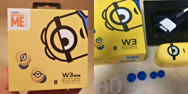 小黄人 W3 的包装盒也是重新设计过的,小黄人的形象和耳机的图示都一目了然,直观方便,想买就买。包装清单也很简单,耳帽,充电座,充电线。