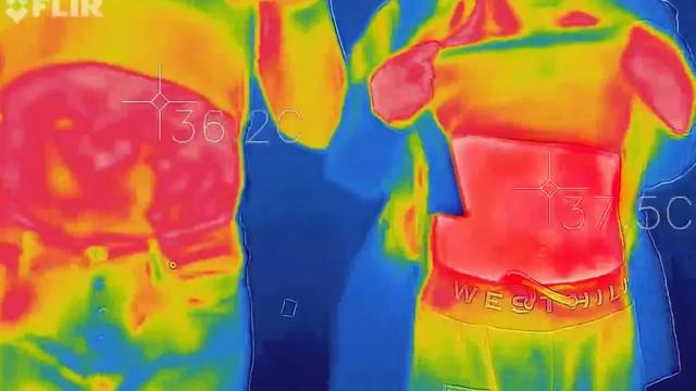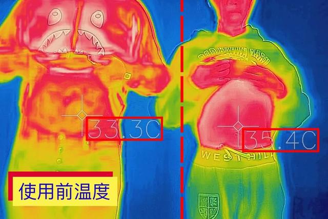 十分钟后,他们将衣服掀开,左侧小哥的身体温度是36.1℃,与穿之前差2.8℃。