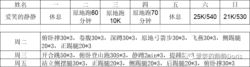 第二天:提踵深蹲靠墙蹲,50次*3组*2,好想出去跑步第三天:提踵深蹲靠墙蹲,50次*3组*3,好想好想出去跑步我眼巴巴地看着远在重庆的队友们还坚持着在偏远的老家跑步打卡,无比嫉妒!这时候,我们的魔鬼来啦!教练七野上线了,给我安排了新一周的训练计划。我一看就懵逼了,“原地跑?什么鬼?”我是一个尊师重教的人,教练怎么说,我就怎么做,如果做不到,肯定是我偷懒,我无情无义无理取闹!换上久违的跑步服装,铺上瑜伽垫,没穿跑鞋,打开手表室内跑步模式,原地跑起来,小腿撩起来。在客厅一边看投影,一边原地跑,1公里之后就有点崩溃跑步一时爽,但是原地一直跑一点也不爽!小腿撩着撩着就抬不起来了,咬牙跑了5公里,果断掐表,体力不支倒地!周三,原地跑60分钟,我偷懒了,换成了1小时体能课。“你们是不是觉得一个人原地跑太无聊?那我们明天开着视频,在线跑步集训吧!”