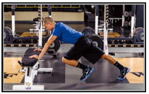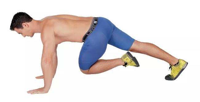 双手放在一个加高平台上,稳定上半身,尤其是肩关节复合体。以有节奏的方式,向胸部上提一个膝盖,然后回到起始姿势。另一条腿重复进行。