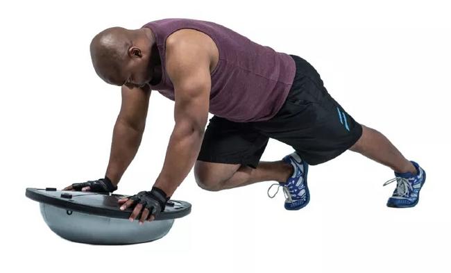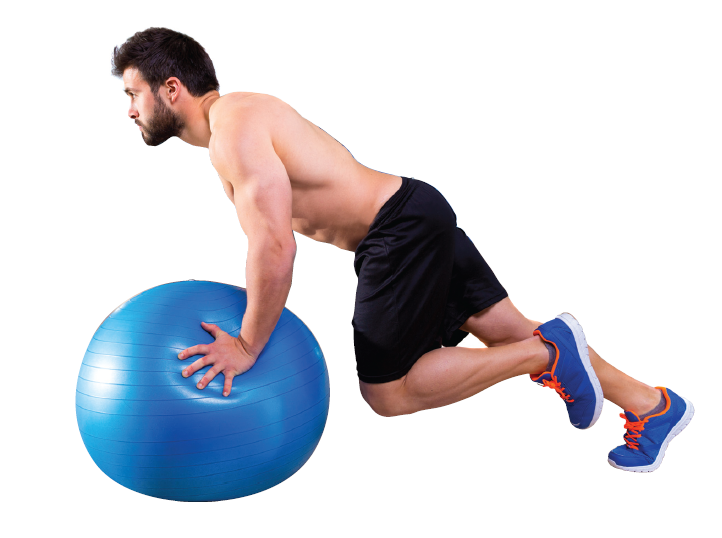 部分下半身位于稳定球上,上提身体,接触点只有稳定球上的下半身和地面上的双手。稳定上半身,尤其是肩关节复合体。向天花板上提髋部,膝盖向胸部拉动(折叠躯干),伸展髋部和膝盖,回到起始姿势。整个运动期间,保持核心部位紧实。