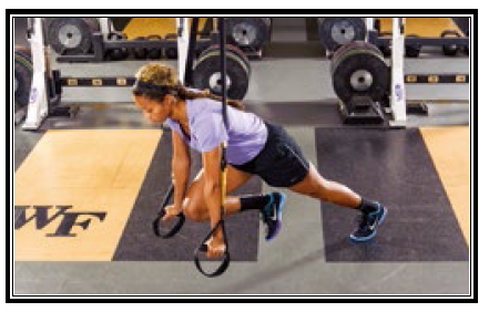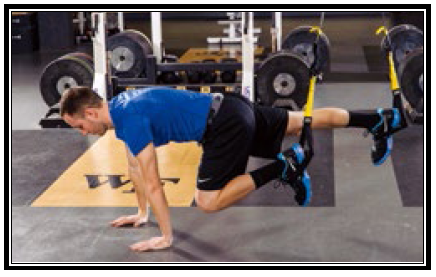 双手放在地面上,且位于双肩正下方。手臂伸直,与地面垂直。安全地用双脚勾住把手(或带子),让身体呈一条直线,接触点只有带子上的双脚和地面上的双手。左右膝盖交替向胸部抬起。避免因为下半身动作而出现代偿性旋转。