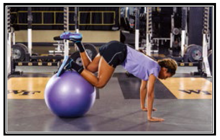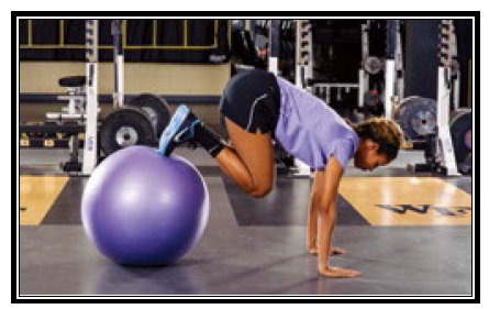 一条腿的部分位于一个稳定球上。另一条腿在髋部弯曲,上提身体,接触点只有稳定球上的腿和地面上的双手。稳定上半身,尤其是肩关节复合体。髋部向天花板方向抬起,工作腿的膝盖向胸部拉动(折叠躯干)。伸展髋部和膝盖,回到起始姿势。整个运动期间,保持核心部位的紧实。