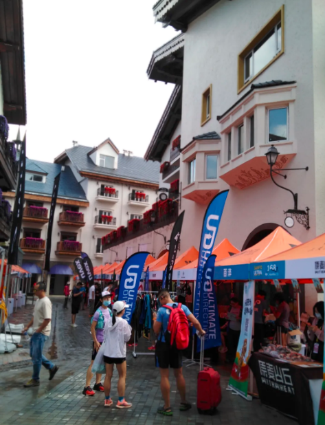 领了换装包,我首先换上备用的羊毛袜子,换双袜子后感觉脚舒服多了,于是把V家T恤也脱了,换上skins的压缩短袖,skins衣服太紧了,我竟然拉不下来,就叫小白帮我把衣服拉到腰部。我还问小白我有没有穿反,因为感觉腋下也有点不舒服,小白看了一下,说没有穿反,我心想,估计是太热,热胀冷缩,胖了,哈哈哈。接着,找到一个卖装备的店里,把优极的红短裤也换成skins的压缩裤。出来后,把越野鞋也换上新的鞋子,感觉全身舒坦多了。
