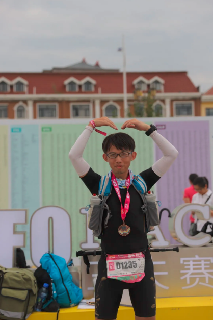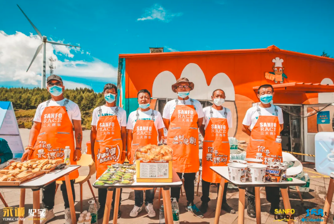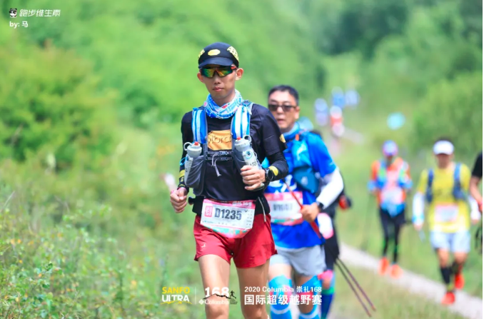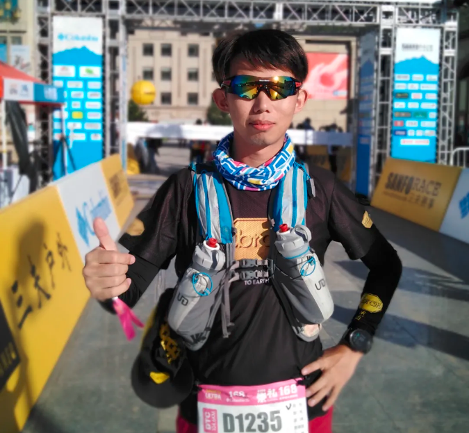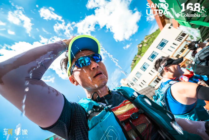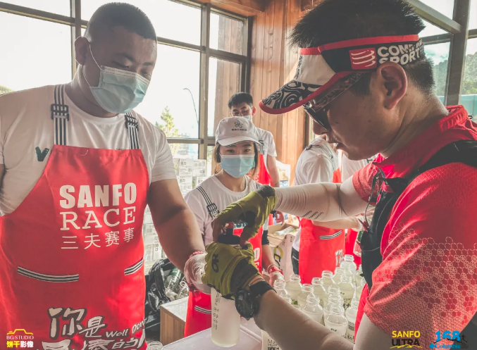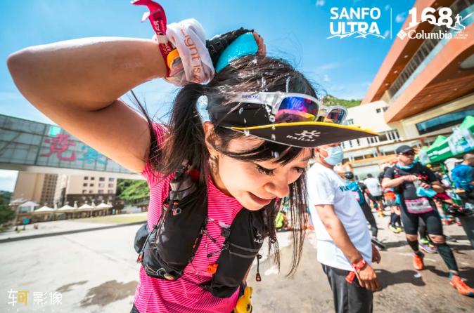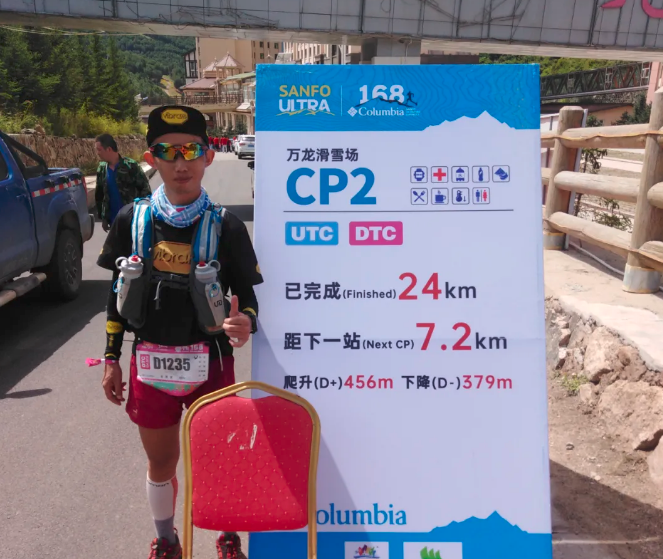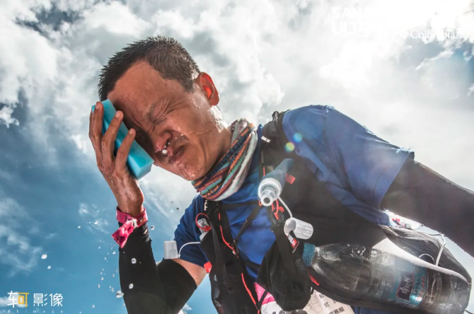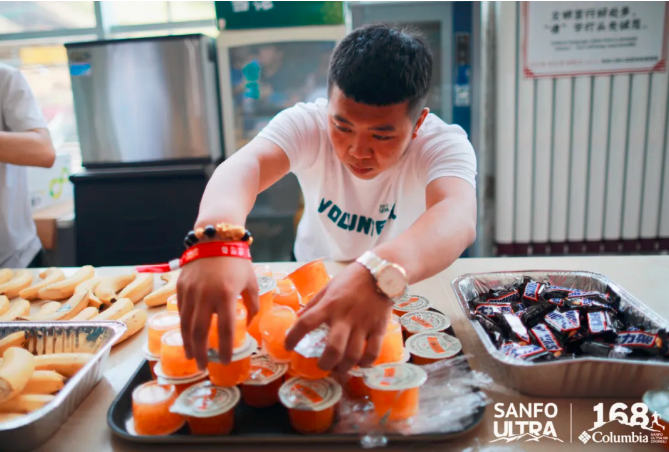 因为第一座山就出现了中暑症状,到了第一个补给站CP1,我就用冰水把袖子、后颈窝、头顶浇了个遍,用来降温,然后进站补给,吃西瓜、香蕉、喝鸡蛋汤、把水壶里补满水,出站之前,又用冰水把袖子、后颈窝、头顶浇了个遍再出站!