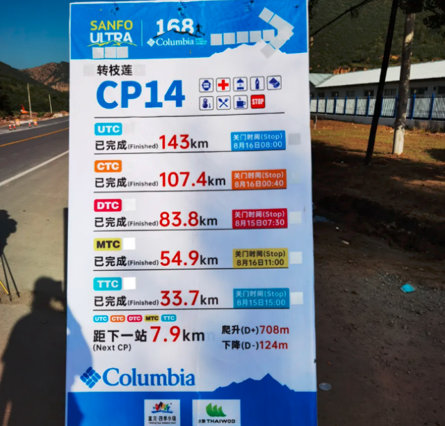 直到离CP14最后3公里的那个下坡,石头和草太多,不敢跑,走路下山,下到山脚下,石头少了我就继续跑起来,顺顺利利,开开心心的达到CP14。CP14是7点半关门,我到的时候大概6点50左右。