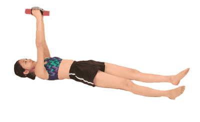 保持平躺仰卧的姿势,两腿打开与肩同宽。两手握紧哑铃并向胸部正上方举起,注意膝盖保持笔直不能弯曲。接着调整呼吸,上身慢慢向左右两侧扭转。左右各10次为一组,重复2—3组。