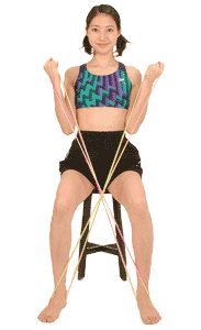 准备好两副橡皮圈。两腿打开与肩同宽。接着两脚各踩住一副橡皮圈的一端,再将橡皮圈左右交叉,两手分别握紧两副橡皮圈的另一端。保持下半身不动,左右扭转上半身。
